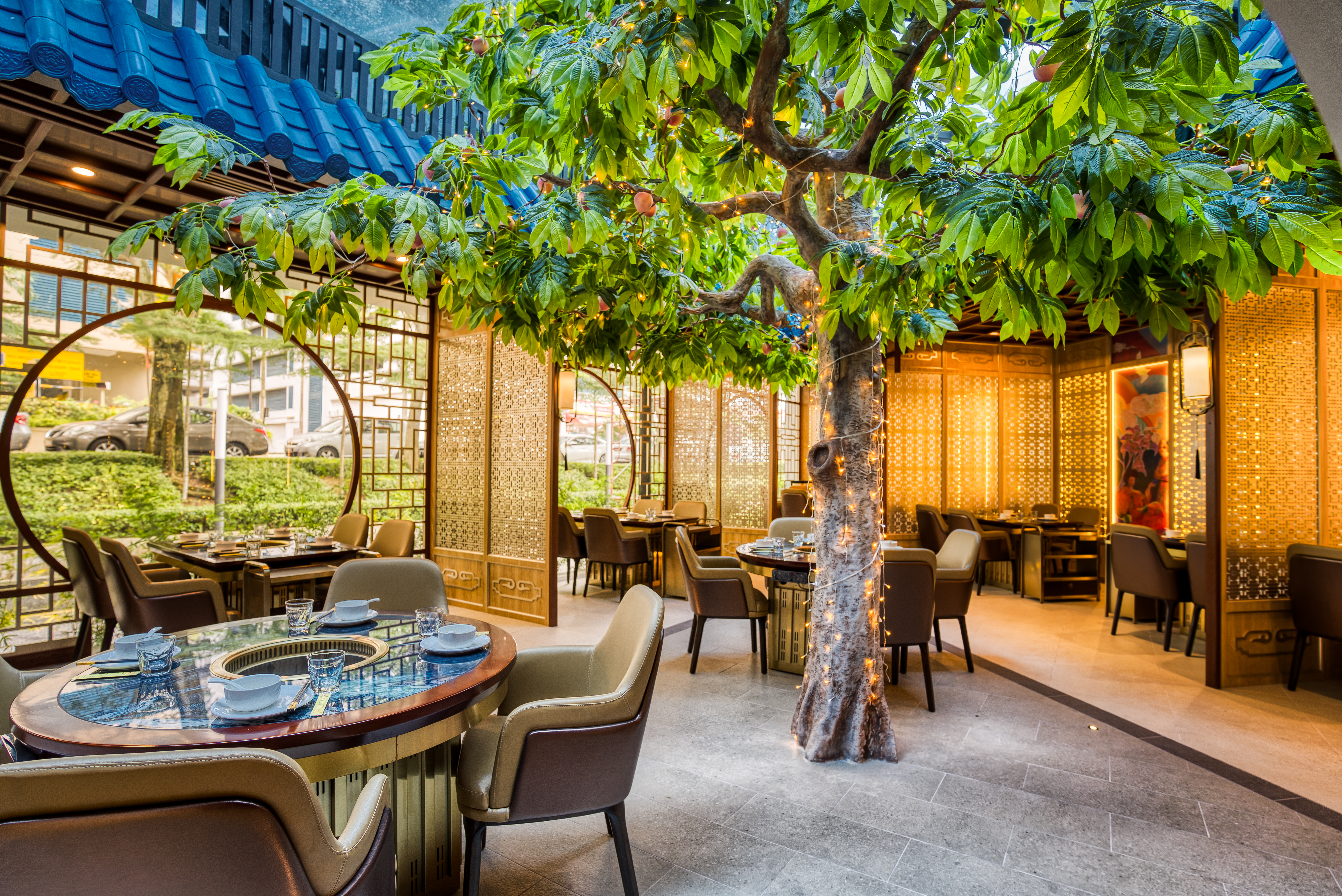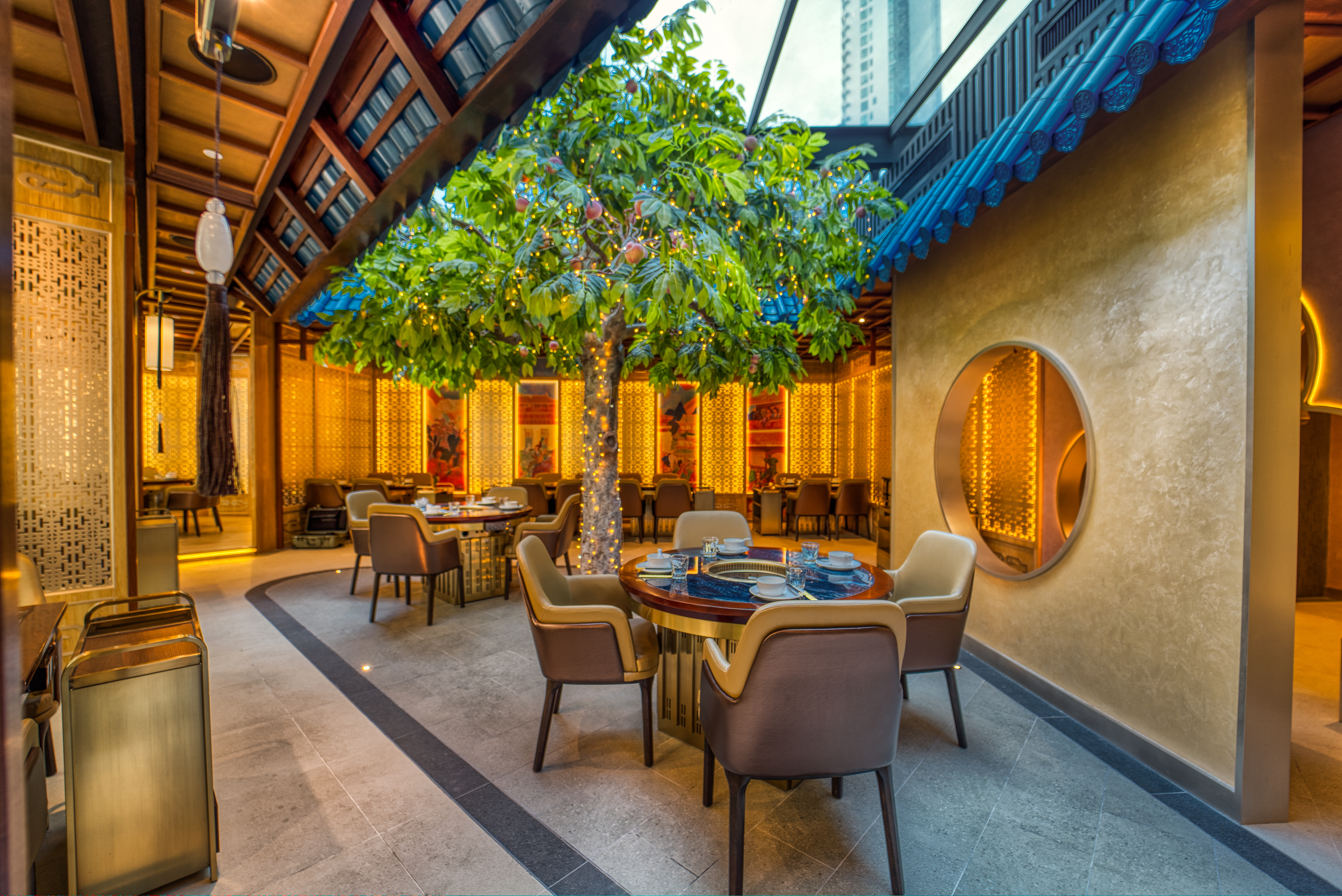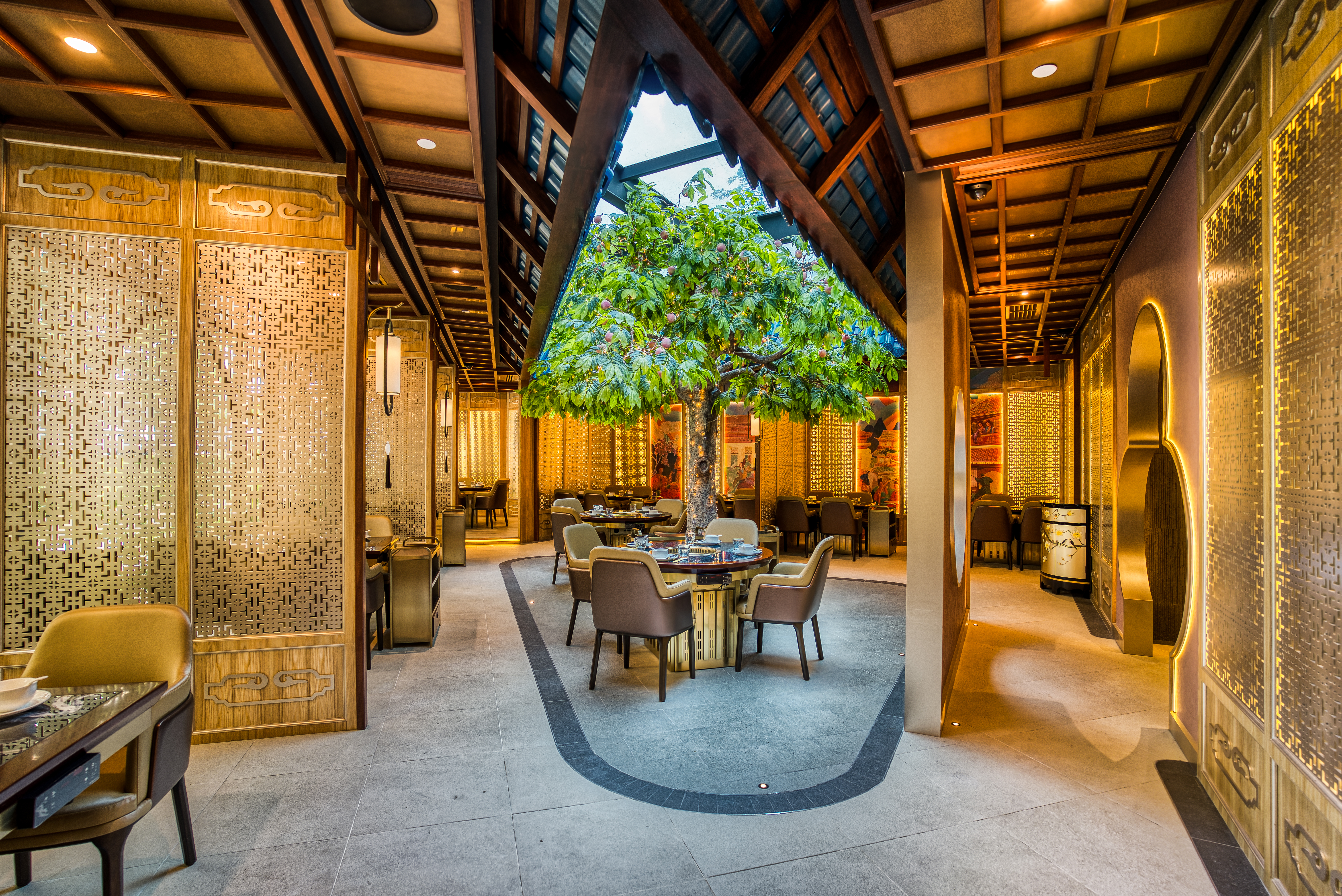 grand artificial blossoming peach tree as the central courtyard centerpiece.