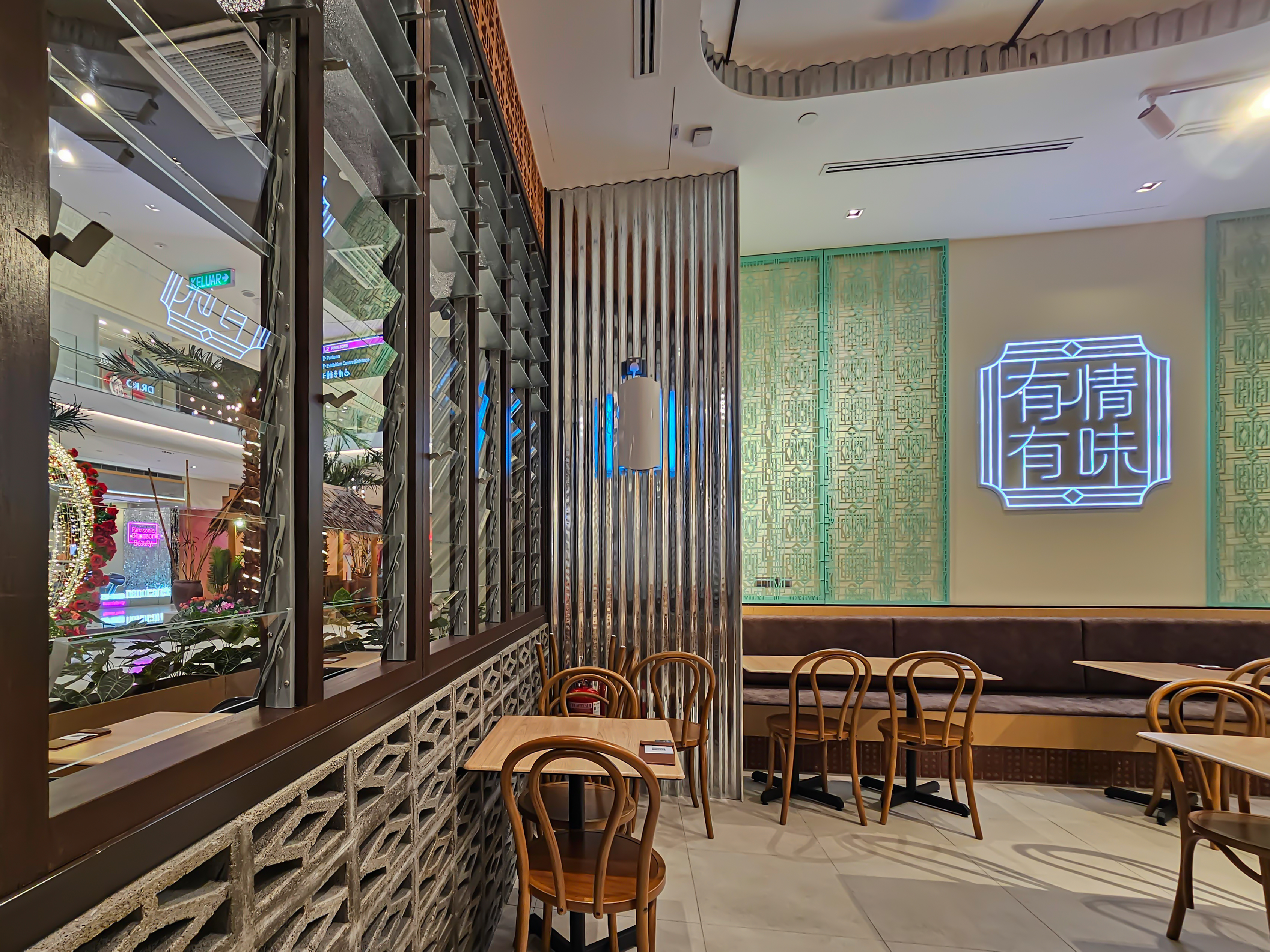 整体设计成功将传统咖啡店略带质朴与工业感的视觉特色,与购物商场环境所需的舒适度及现代感相互融合,在提升空间体验的同时,也更完整地呈现品牌主打的地道南洋风味与本土餐饮文化。