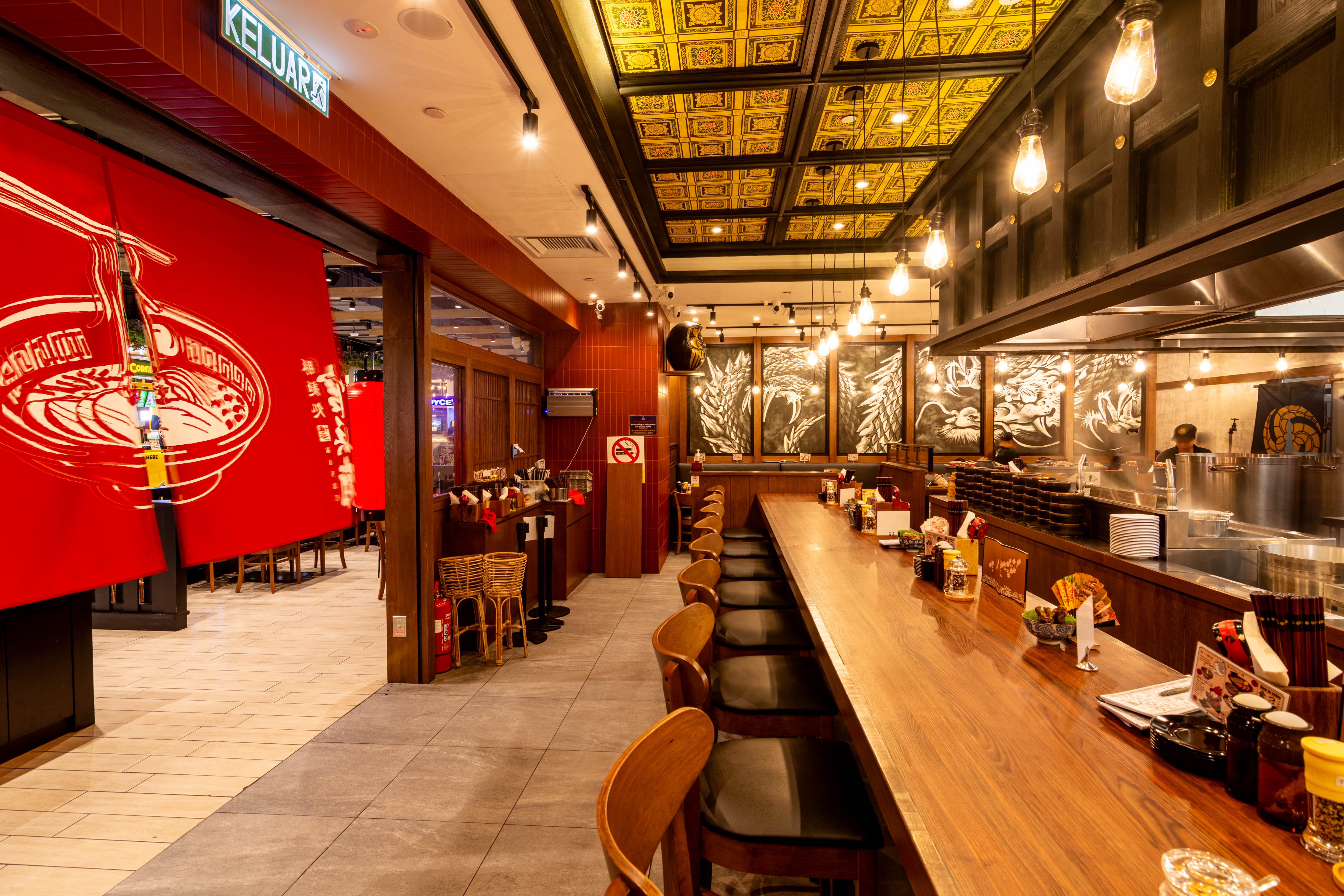 本项目以重现 东京拉面吧的地道氛围 为设计核心,完整延续品牌一贯 “专注风味” 的用餐理念。整体空间规划围绕开放式用餐体验展开,使顾客在进入门店后,能够直接感受到品牌鲜明而集中的餐饮特色。