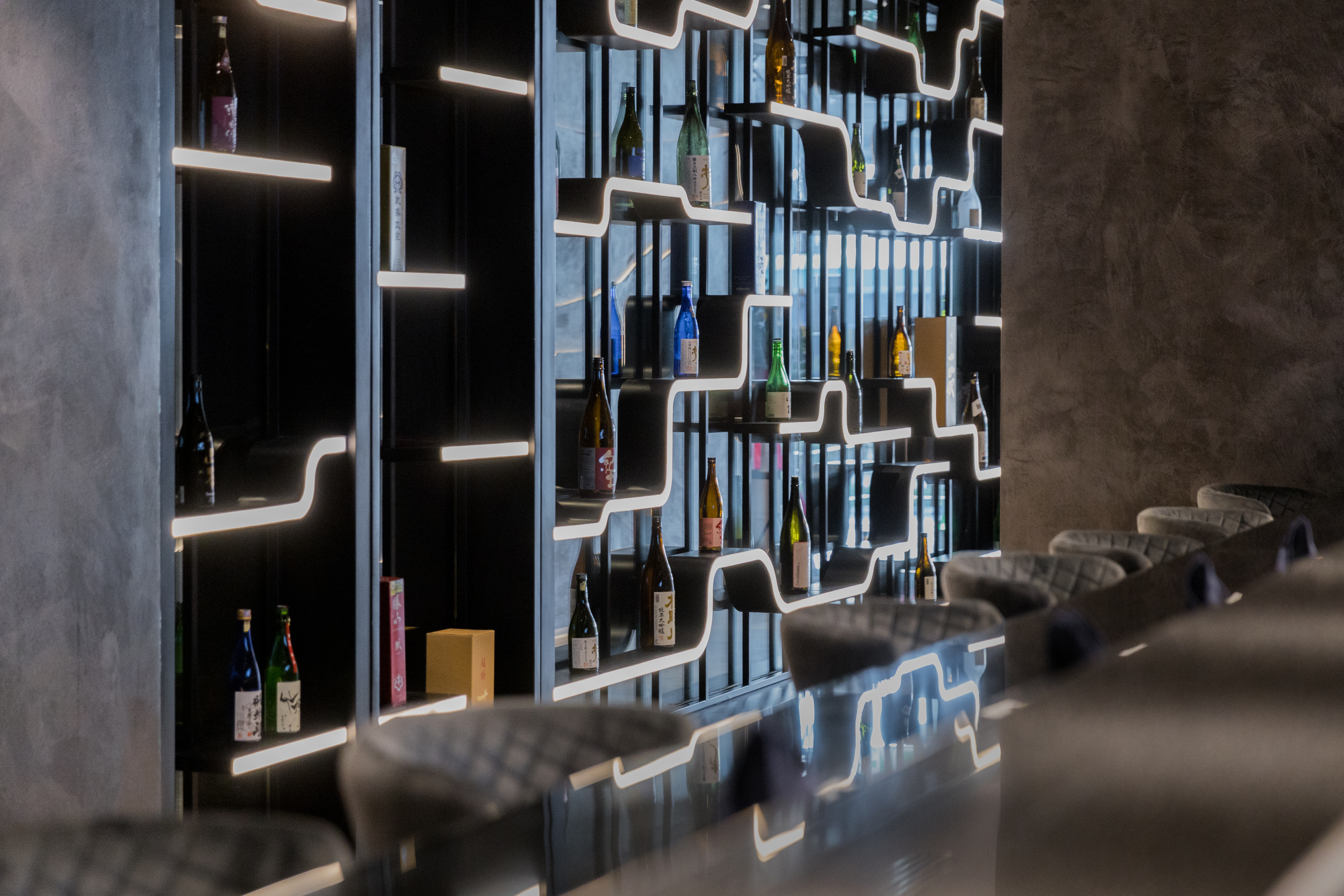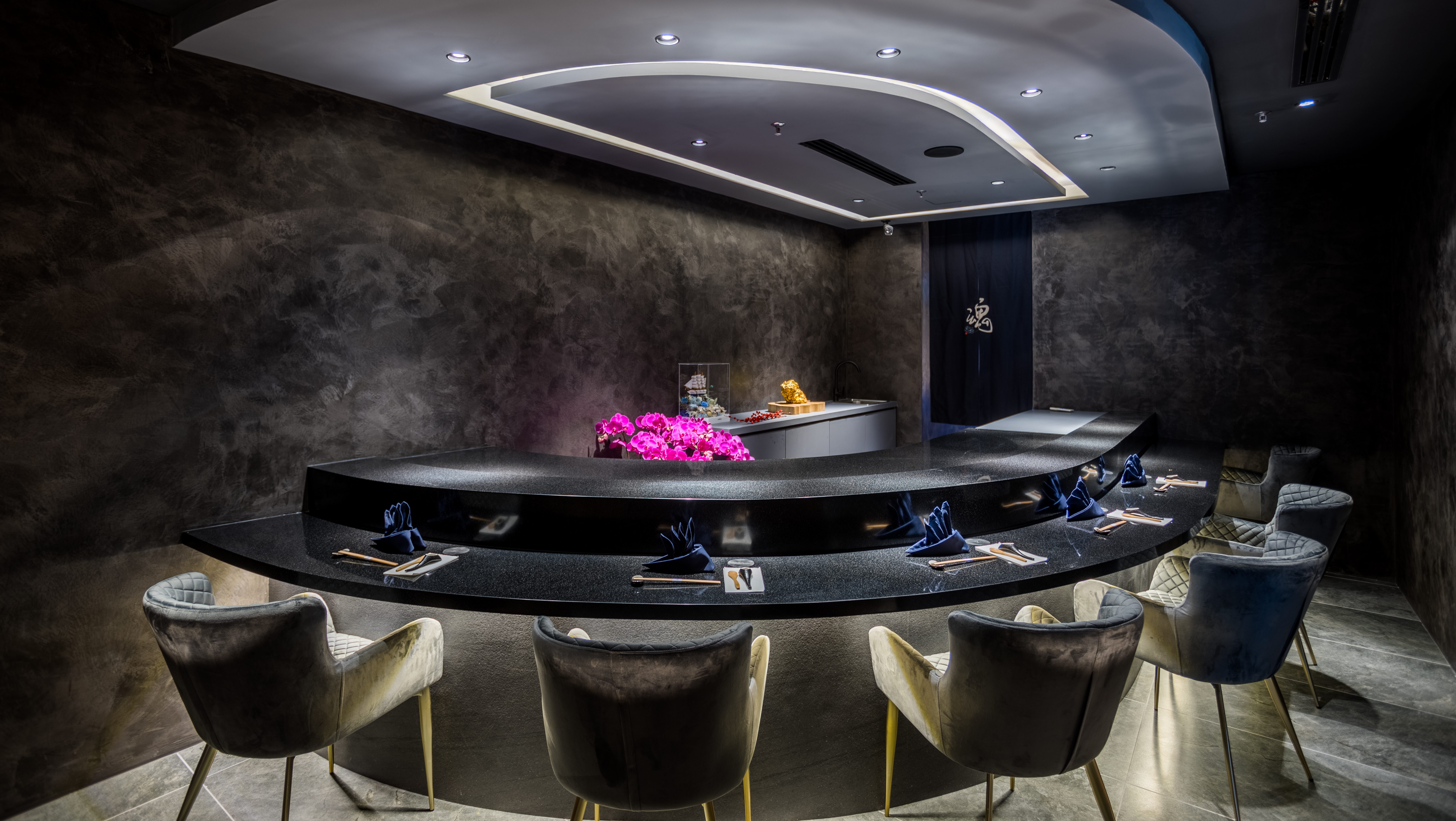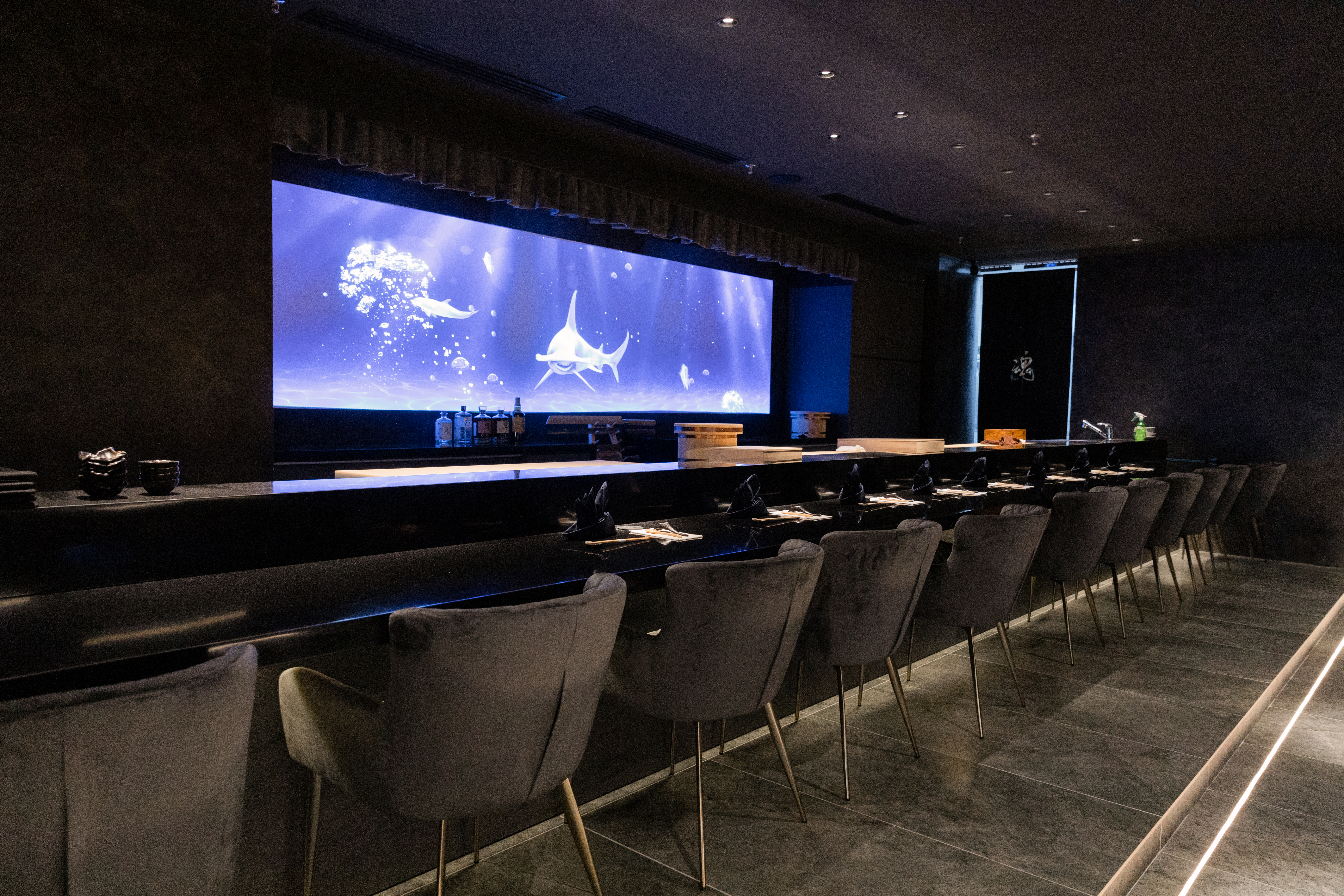 空间核心为一座修长而醒目的 寿司吧台,让主厨能够在顾客面前完成料理制作与呈现,强化 Omakase 用餐形式所强调的互动感、仪式感与现场体验。吧台后方结合数码屏幕投影,展示不断变化的日式静物场景,为整体空间增添细腻而富有层次的视觉演绎。